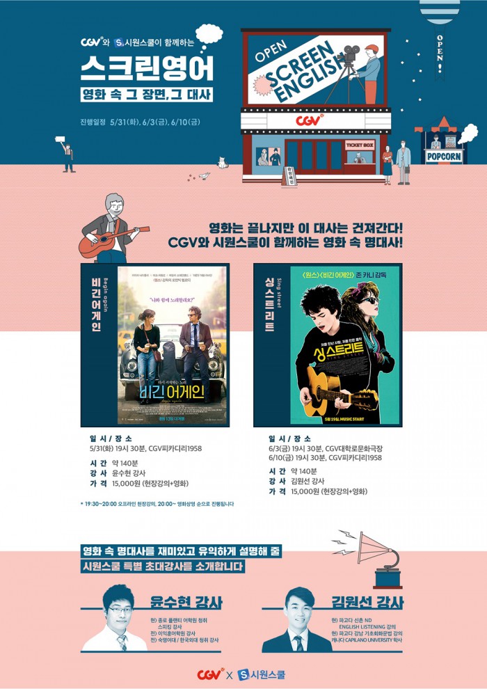 CGV피카디리 1958에선 오는 31일, 다음달 10일 저녁 7시30분부터, CGV대학로에선 다음달 3일 저녁 7시 30분부터 클래스가 진행된다. 스크린영어 클래스 상영작으론 인기 감성영화 '비긴 어게인'과 '싱 스트리트' 2작품이 선정됐다.