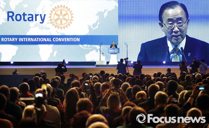 (서울=포커스뉴스) 반기문 유엔 사무총장이 29일 오전 경기 고양시 킨텍스 제1전시장에서 열린 2016 국제로타리 세계대회에 참석해 기조연설 하고 있다.