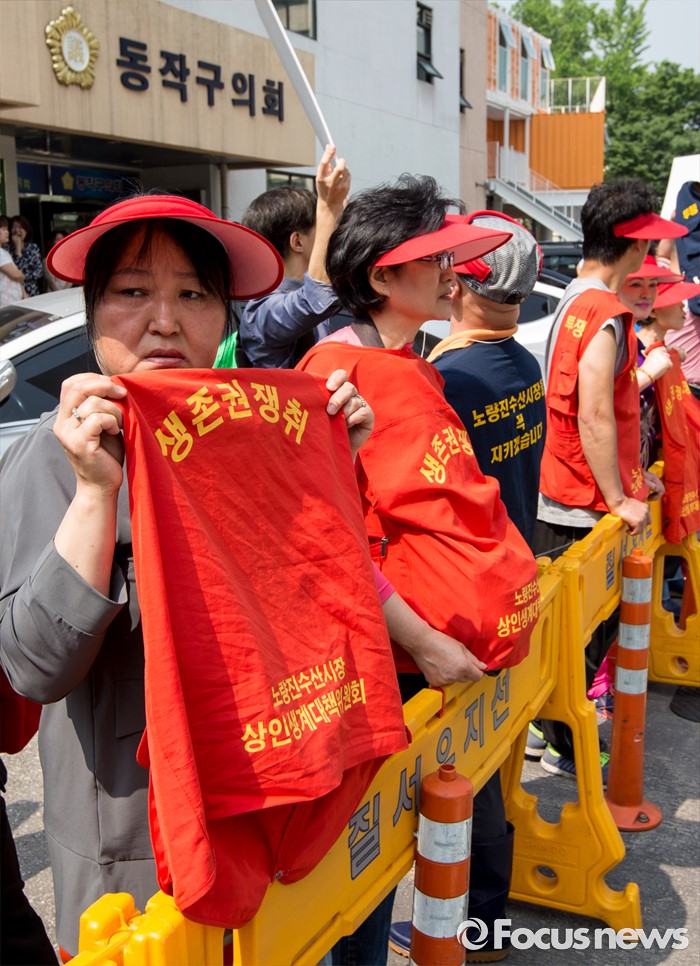 (서울=포커스뉴스) 30일 오전 서울 동작구청에서 노량진수산시장 상인생계대책위원회 관계자들이 박원순 서울시장과의 면담을 요구하며 기다리고 있다.