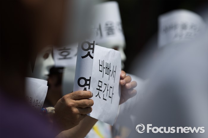 (서울=포커스뉴스) 30일 오후 서울 종로구 광화문 광장에서 환경보건시민센터 관계자들이 옥시 전 사장 검찰소환 조사 촉구하는 기자회견 및 퍼포먼스를 열고 있다.