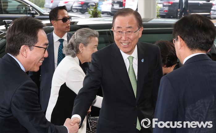 (인천공항=포커스뉴스) 방한 일정을 마친 반기문 유엔 사무총장(가운데)이 30일 오후 출국을 위해 인천국제공항에 도착, 조태열 외교부 제2차관(왼쪽)과 정일영 인천공항공사 사장의 영접을 받고 있다.