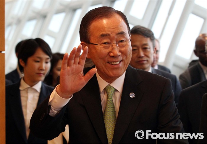 (인천공항=포커스뉴스) 방한일정을 마친 반기문 유엔 사무총장이 30일 오후 인천국제공항에서 출국에 앞서 취재진에 손을 들어 인사하고 있다.