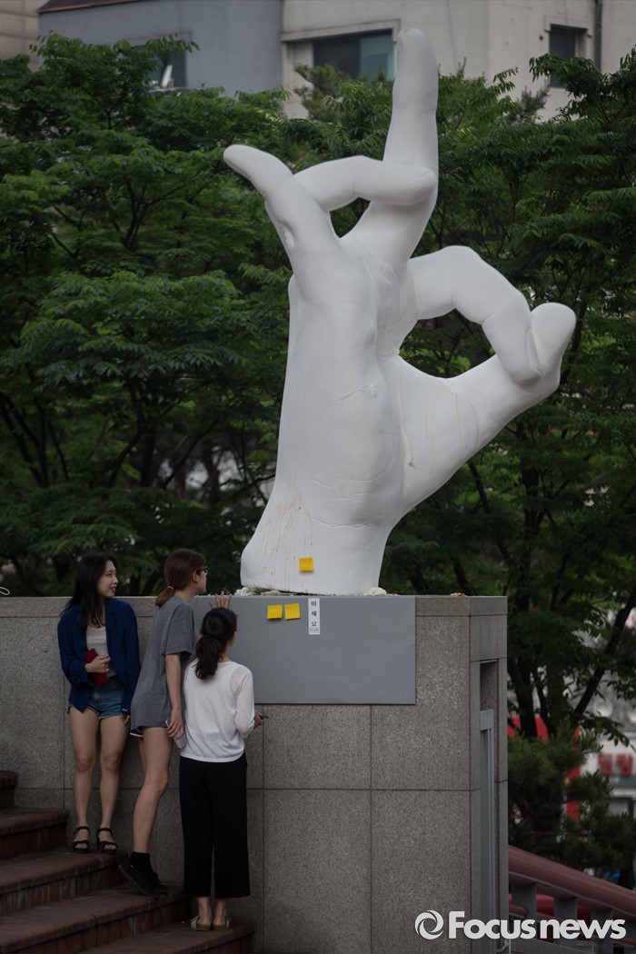 (서울=포커스뉴스) 홍익대학교 학생들이 31일 오전 서울 마포구 홍익대 정문 앞에 세워진 일베' 상징물 조각상을 바라보고 있다. 조각상은 일간베스트저장소를 상징하는 자음 'ㅇ'과 'ㅂ' 모양을 하며 회원을 인증하는 손 모양이다. 이 조각상은 조소과 4학년 홍기하씨가 '환경조각연구' 수업 과제로 제작되어 '환경조각연구 야외조각전에 출품한 것으로 '어디에나 있고, 아무데도 없다'는 제목을 붙였다.