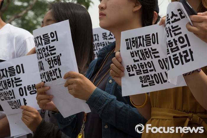 (서울=포커스뉴스) 한일 일본군위안부 합의 무효를 위한 대학생 대책위원회 학생들이 31일 오전 서울 종로구 대한민국역사박물관 앞에서 일본군위안부 피해자 의견 배제한 재단설립 강행 규탄 기자회견을 열고 있다.
