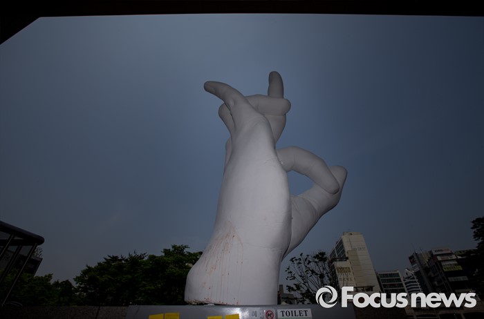 (서울=포커스뉴스) 31일 오후 서울 마포구 홍익대학교 정문에 극우성향 사이트 '일베' 상징물 조각상이 설치돼 있다. 조각상은 일간베스트저장소를 상징하는 자음 'ㅇ'과 'ㅂ' 모양을 하며 회원을 인증하는 손 모양이다. '어디에나 있고, 아무데도 없다'는 제목의 이 조각상은 조소과 4학년 홍기하씨가 '환경조각연구' 수업 과제로 제작해 야외조각전에 출품한 것이다.