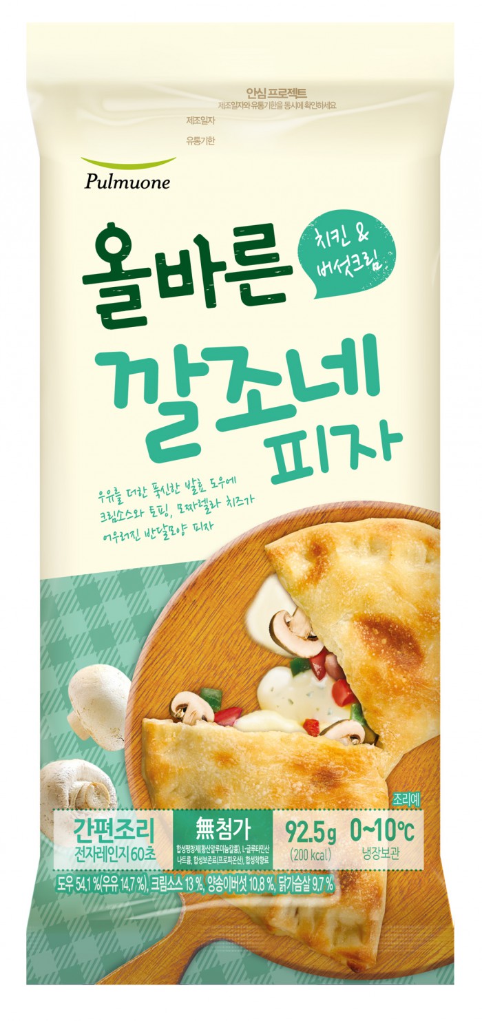 '깔조네'는 밀가루 반죽 사이에 고기와 치즈, 채소 등을 넣고 반달 모양으로 구워낸 이탈리안식 요리를 말한다. '올바른 깔조네피자'는 깔조네에서 모양과 맛을 착안, 동그란 발효 도우(dough) 사이에 다양한 토핑과 풍부한 소스를 넣고 반달 모양 형태로 접어서 오븐에 구워내 모양도 맛도 이색적인 냉장 피자 제품이다.
