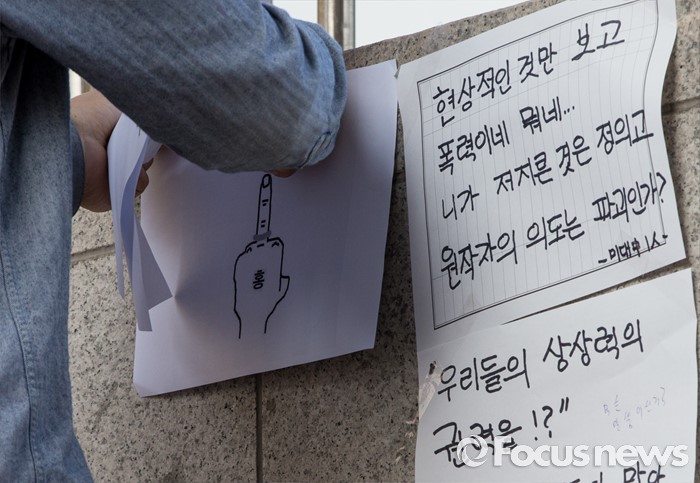 (서울=포커스뉴스) 1일 오전 서울 마포구 홍익대학교 정문에 설치된 극우성향 사이트 '일베' 상징물 조각상이 파손된 가운데 한 학생이 이를 비판하는 글을 정문에 붙이고 있다. 조각상은 일간베스트저장소를 상징하는 자음 'ㅇ'과 'ㅂ' 모양을 하며 회원을 인증하는 손 모양이다. '어디에나 있고, 아무데도 없다'는 제목의 이 조각상은 조소과 4학년 홍기하씨가 '환경조각연구' 수업 과제로 제작해 야외조각전에 출품한 것이다.