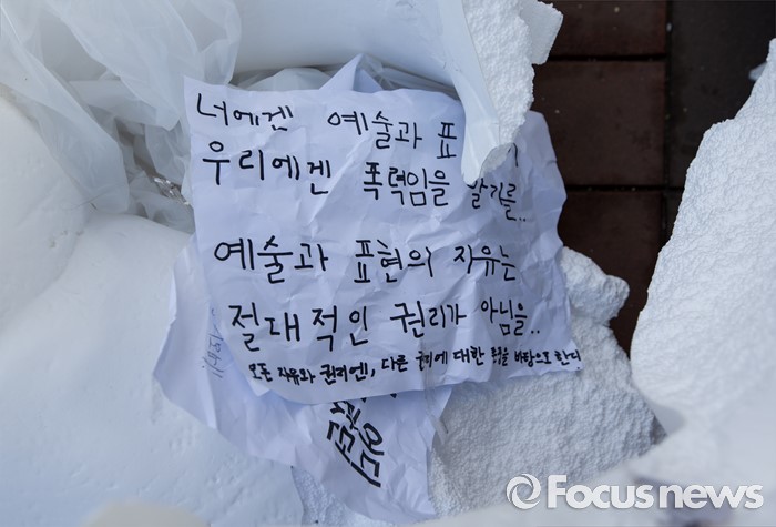 (서울=포커스뉴스) 1일 오전 서울 마포구 홍익대학교 정문에 설치된 극우성향 사이트 '일베' 상징물 조각상이 파손된 가운데 이를 비판하는 글이 담긴 종이가 조소상에 붙어있다. 조각상은 일간베스트저장소를 상징하는 자음 'ㅇ'과 'ㅂ' 모양을 하며 회원을 인증하는 손 모양이다. '어디에나 있고, 아무데도 없다'는 제목의 이 조각상은 조소과 4학년 홍기하씨가 '환경조각연구' 수업 과제로 제작해 야외조각전에 출품한 것이다.