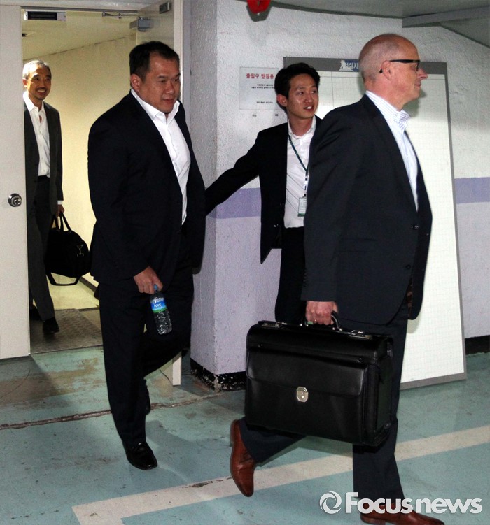 (서울=포커스뉴스) 2일 오후 서울 종로구 현대상선 본사에서 열린'G6' 해운동맹 회원사 협렵방안 회의에 참석한 제3 글로벌 해운동맹 디 얼라이언스 소속 해외 선사 관계자들이 회의를 마친 뒤 주차장으로 향하고 있다.