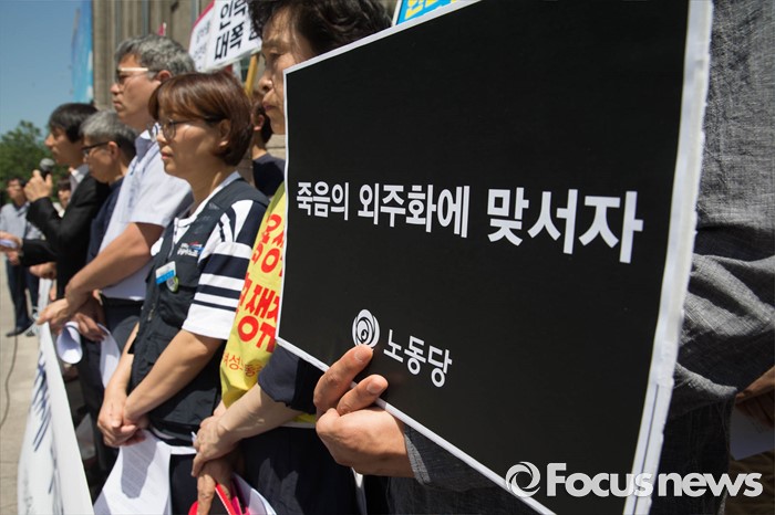 (서울=포커스뉴스) 2일 오전 서울 중구 서울시청 정문 앞에서 '서울시 지하철 하청노동자 사망재해 해결을 위한 시민대책위원회(가칭)'가 지하철 2호선 구의역 사고에 대한 책임자 처벌과 대책마련을 촉구하며 기자회견을 하고 있다.