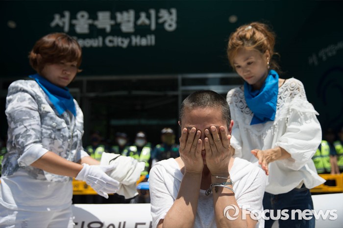 (서울=포커스뉴스) 2일 오후 서울 중구 서울시청 정문 앞에서 장애인부모연대원들이 발달장애인 정책수립을 촉구하며 삭발식을 하고 있다.