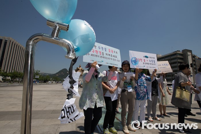 (서울=포커스뉴스) 2일 오전 서울 종로구 광화문 광장에서 수돗물 시민네트워크 관계자들이 수돗물 불신조장감시센터 방송 모니터링단 발대식을 열고 있다.