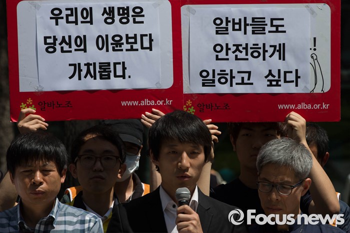 (서울=포커스뉴스) 2일 오전 서울 중구 서울시청 정문 앞에서 '서울시 지하철 하청노동자 사망재해 해결을 위한 시민대책위원회(가칭)'가 지하철 2호선 구의역 사고에 대한 책임자 처벌과 대책마련을 촉구하며 기자회견을 하고 있다.