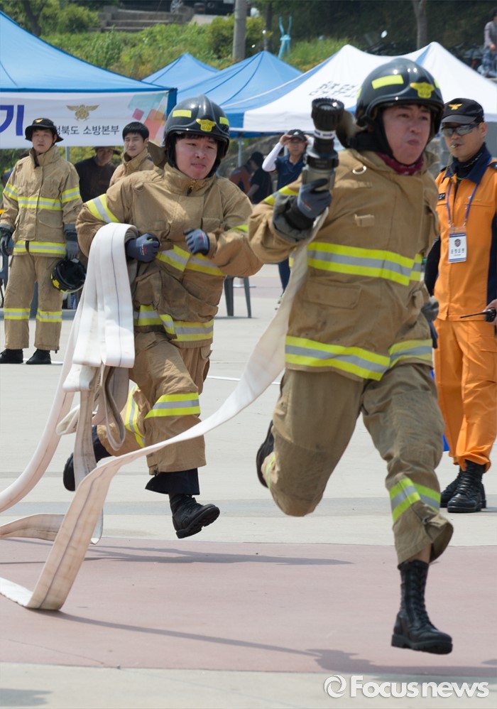 (청주=포커스뉴스) 3일 오전 충북 청주 무심천시민체육공원에서 열린 충북소방기술경연대회에 참가한 소방대원들이 기량을 겨루고 있다.