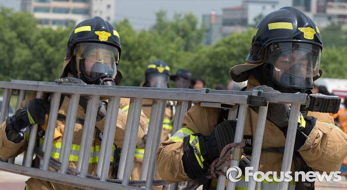 (청주=포커스뉴스) 3일 오전 충북 청주 무심천시민체육공원에서 열린 충북소방기술경연대회에 참가한 소방대원들이 기량을 겨루고 있다.