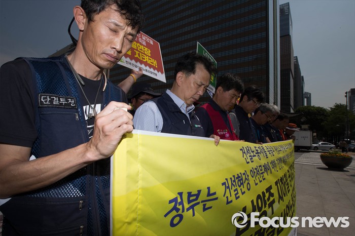 (서울=포커스뉴스) 3일 오전 서울 종로구 광화문광장에서 건설산업연맹원들이 남양주 지하철 폭발 및 붕괴사고에 대해 책임자 처벌과 건설현장 안전문제 대책 마련을 촉구하며 기자회견을 시작하기 앞서 희생자들을 위해 묵념하고 있다.