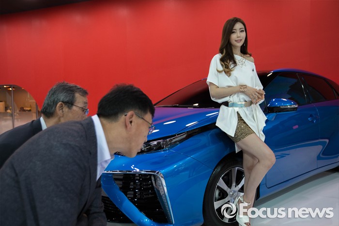 (부산=포커스뉴스) 3일 오후 부산 해운대구 벡스코에서 '2016 부산 국제모터쇼'가 공식 개막한 가운데 레이싱걸이 관람객들을 향해 포즈를 취하고 있다. 이번 국제모터쇼는 오는 12일 까지 계속 된다.