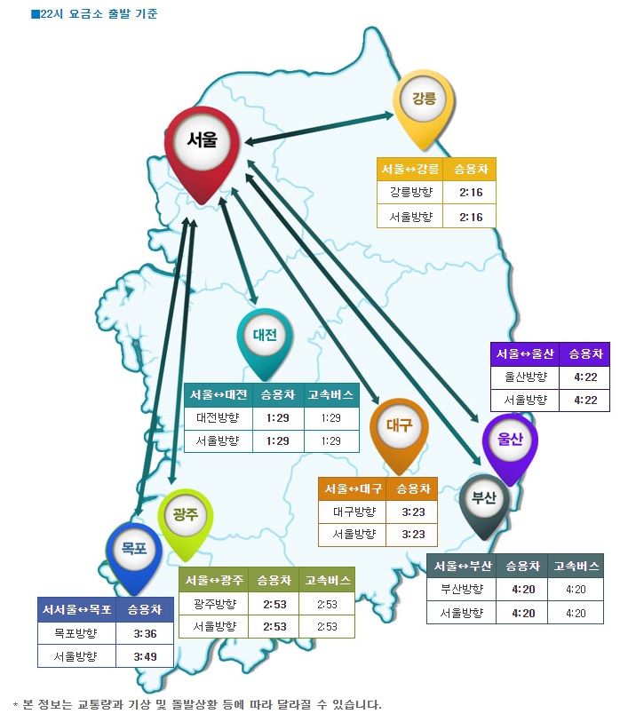 서울에서 주요도시까지 소요되는 시간은 오후 10시 기준 강릉 2시간 16분, 부산 4시간 20분, 광주 2시간 53분, 목포 3시간 36분, 대전 1시간 29분 등이다.