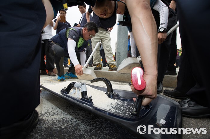 (서울=포커스뉴스) 7일 오후 서울 여의도 국회 정문 앞에서 열린 밥쌀 수입 강행하는 박근혜 정부 규탄 기자회견 시작 전 전국농민회총연맹 회원들이 쌀을 옮기는 과정에서 쌀이 바닥에 쏟아져 경찰들이 방패에 담고 있다.