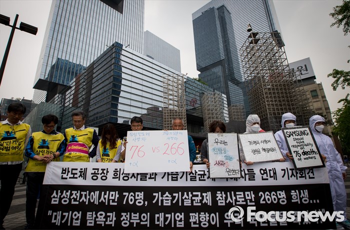 (서울=포커스뉴스) 7일 오후 서울 서초구 삼성전자 사옥 앞에서 열린 '반도체 공장 희생자들과 가습기살균제 피해자들 연대 기자회견'에서 가피모 및 반올림 회원들이 희생자들을 위한 묵념을 하고 있다.