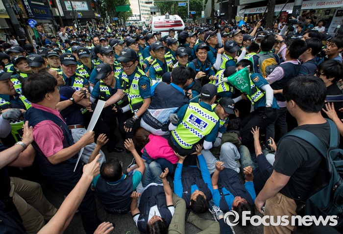 (서울=포커스뉴스) 8일 오후 서울 을지로 옛 국가인권위원회 옥상 광고탑에서 기아자동차 비정규직 노동자의 정규직화를 요구하며 363일 동안 고공농성을 벌인 한규협씨와 최정명씨가 경찰에 의해 구급차로 끌려가자 노조원들이 차량을 막아서고 있다.