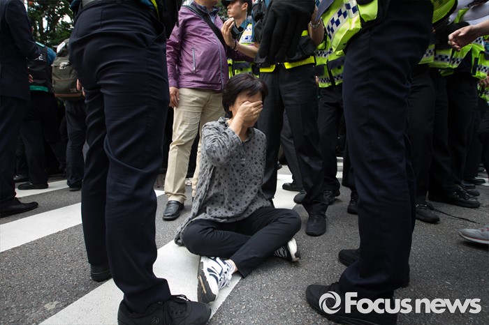 (서울=포커스뉴스) 사내하청 전원 정규직화를 요구하며 고공농성을 벌여온 기아자동차 사내하청 노동자 최정명씨와 한규협씨가 농성을 중단한 8일 오후 서울 중구 옛 국가인권위원회 건물 옥상 광고탑 농성장에서 내려와 병원으로 이동하던 중 경찰들과 신랑이 한 노조원이 길바닥에 앉아 있다.