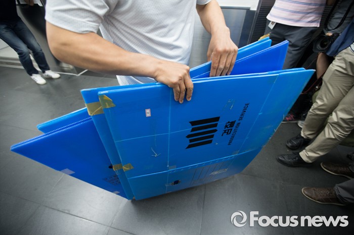 (서울=포커스뉴스) 검찰이 롯데그룹 비자금조성 의혹과 관련해 롯데호텔과 신동빈 회장 자택 등을 압수수색한 10일 오후 서울 중구 롯데그룹 본사로 검찰 수사관이 박스를 들고 가고 있다.