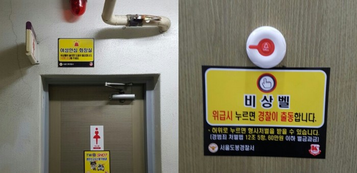 지난 4월 심야시간에 여성 혼자 운영하는 편의점 70곳을 상대로 계산대 밑에 비상벨을 설치해 위급상황에 비상벨을 발로 밟으면 112상황실로 신고가 접수되는 시스템을 설치한 바 있다.화장실 내부에 설치된 비상벨을 누르면 외부 경광등이 울리는 동시에 112 신고가 접수된다. 24시간 긴급신고가 가능한 투샷시스템이 구축된 화장실 외부에 경광등이 설치돼 있다.(왼쪽) <사진제공=서울 도봉경찰서>