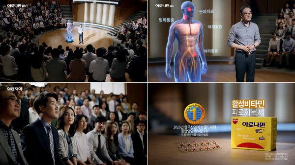 이번 광고에서도 청중을 대상으로 강연을 하는 연출을 통해, 피로에 의한 근육통, 신경통을 풀어주는 종합 활성비타민 아로나민골드의 효능을 강조했다.