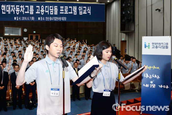 한편 지난 2월부터 시작된 고용디딤돌 1기 프로그램 참가자 302명은 현재 협력사에서 인턴으로 근무하고 있으며, 현대차그룹은 매년 800명 규모로 2018년까지 3년 간 총 2400명의 청년들에게 자동차 직무 교육과 현대기아차 1차 협력사에서의 인턴십 기회를 제공할 예정이다.현대차그룹 고용디딤돌2기 청년인재 대표자 이호섭 군과 김선희 양이 입교식 선서를 하고 있는 모습. <사진제공=현대차그룹>