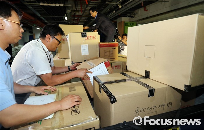 (서울=포커스뉴스) 10일 오후 서울 중구 소공동 롯데호텔에서 검찰 수사관들이 롯데그룹 정책본부 등 계열와 신동빈 롯데그룹 회장 집무실에서 압수수색한 서류를 화물차에 싣고 있다.