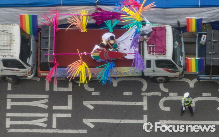 (서울=포커스뉴스) 11일 오후 서울광장에서 열린 제17회 퀴어문화축제에서 참가자들이 행사를 준비하고 있다.