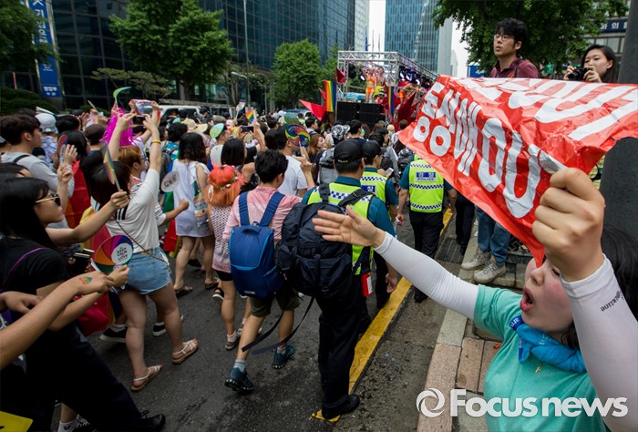 (서울=포커스뉴스) 11일 오후 제17회 퀴어문화축제 참가자들이 서울광장을 출발해 을지로일대를 지나며 퀴어퍼레이드를 벌이자 한 시민이 이를 규탄하는 손팻말을 들고 있다.