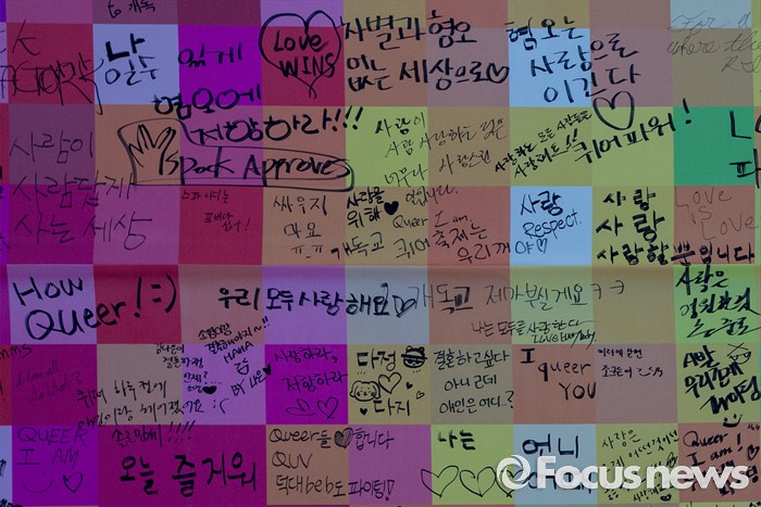 (서울=포커스뉴스) 11일 오후 서울광장에서 열린 제17회 퀴어문화축제 포토월에 남긴 참가자들의 문구.