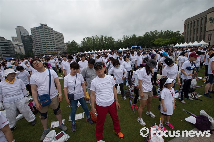 (서울=포커스뉴스) 12일 오전 서울 중구 서울시청 광장에서 열린 제 7회 나라사랑 고궁걷기 대회에 참가한 시민들이 출발 전 준비운동을 하고 있다.