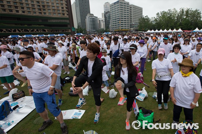 (서울=포커스뉴스) 12일 오전 서울 중구 서울시청 광장에서 열린 '제7회 나라사랑 고궁걷기 대회'에 참가한 시민들이 준비운동을 하고 있다.