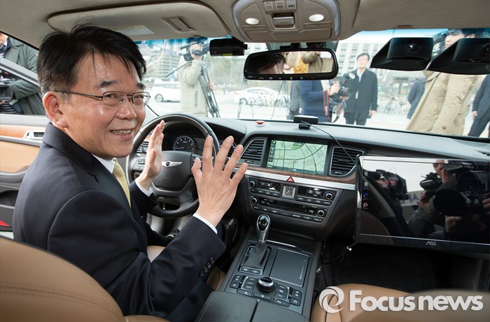 최정호 차관은 “자율주행차 융·복합 미래포럼이 산학연 각 분야가 축적하고 있는 경험과 전문지식을 모아 자율주행차가 가져올 새로운 교통혁명시대를 준비하는 토론의 장으로서 큰 역할을 해주길 당부한다”고 말했다.(세종=포커스뉴스) 7일 오전 세종시 정부세종청사 국토교통부 앞에서제1호 자율주행차 시험운행 허가 및 시연이 열린 가운데 현대 제네시스가 국내 자율주행차 임시운행 제1호차로 허가받고 도로주행을 시작했다. 강호인 국토교통부장관이 시범운행차량을 시승하고 있다. 2016.03.07 김기태 기자