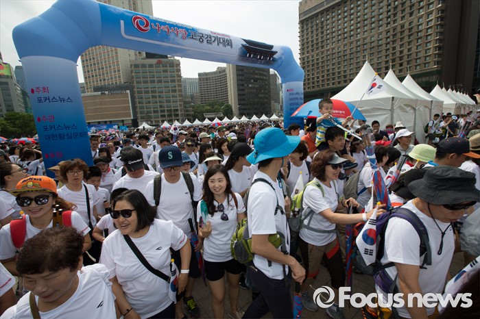 (서울=포커스뉴스) 축포가 터졌다. 서울광장을 가르는 깃발을 중심으로 1조와 2조로 나뉜 참가자들은 서두르지 않았다. 대신 도란도란 담소를 나누며 자신의 출발 순서를 기다렸다. 그렇게 포커스뉴스가 주최한 제7회 나라사랑 고궁걷기대회가 시작됐다.