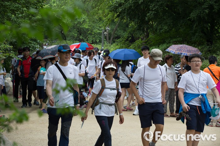 (서울=포커스뉴스) 12일 오전 서울 종로구 창경궁에서 '제7회 나라사랑 고궁걷기 대회'에 참가한 시민들이 고궁을 둘러보며 걷고 있다.