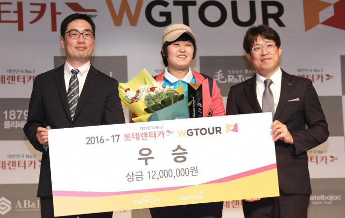 '2016-17 롯데렌터카 WGTOUR'의 모든 경기는 롯데렌터카가 메인스폰서를, 까스텔바쟉, 1879폴리페놀, AB&I, 테일러메이드, 모리턴, 1872더치커피 등이 오피셜 스폰서로 참여한다. 1차 대회 결선은 오는 27일 밤 10시30분 SBS 골프 채널을 통해 녹화방송 될 예정이다.'2016-17 롯데렌터카 WGTOUR' 개막전에서 우승을 거머쥔 유진아(가운데)가 기념촬영하고 있다.<사진제공=골프존>