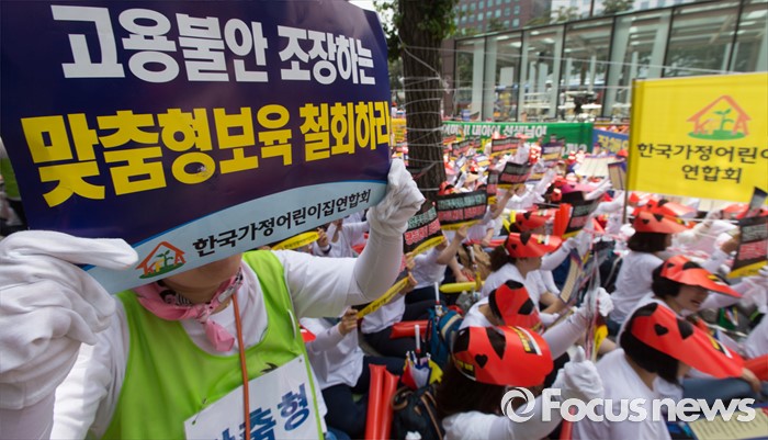 (서울=포커스뉴스) 13일 오후 서울 여의도 KB국민은행 앞에서 한국가정어린이집연합회 회원들이 맞춤형 보육 저지와 누리과정 예산 해결 및 평등지원 촉구 결의대회를 하고 있다.