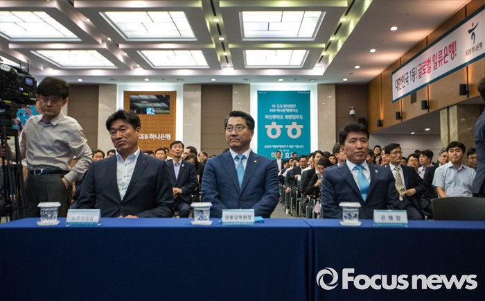 (서울=포커스뉴스) 13일 오후 서울 중구 KEB 하나은행 본점에서 열린 'One Bank, New Start' 선언식에 진웅섭(중앙) 금융감독원장, 함영주(오른쪽) KEB 하나은행장이 참석해 있다.