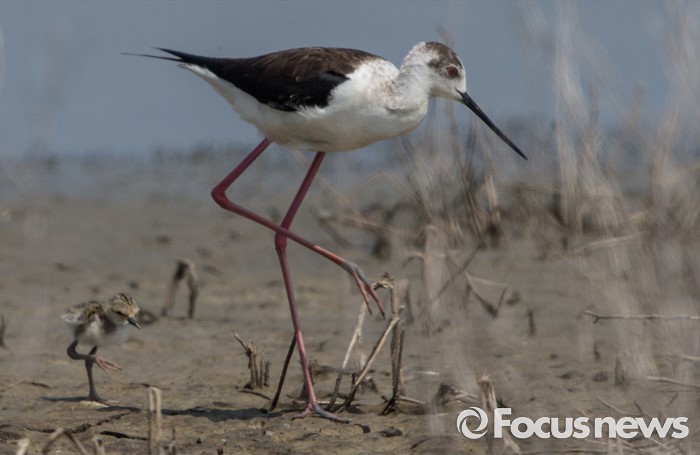 (인천=포커스뉴스) 장다리물떼새 새끼가 인천시 영종도 갯벌습지에서 아빠를 따라 걸음마를 배우고 있다.