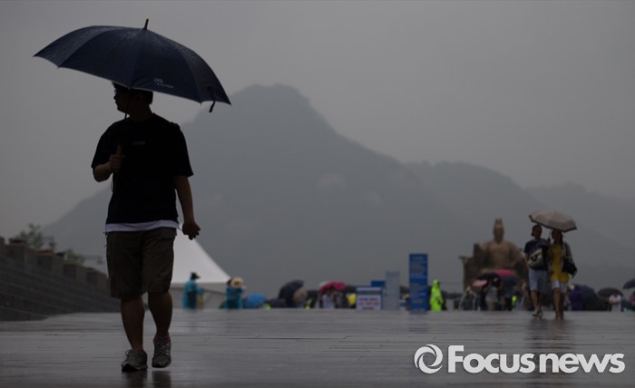 (서울=포커스뉴스) 전국적으로 비가 내리는 15일 오후 서울 종로구 광화문광장을 지나는 시민들이 비를 피해 발걸음을 재촉하고 있다.