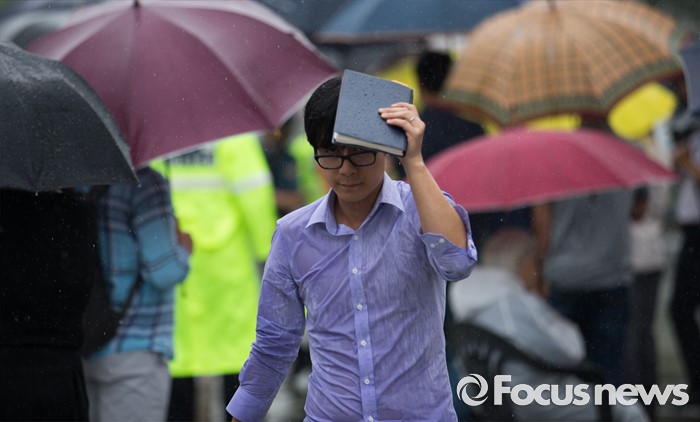 (서울=포커스뉴스) 전국적으로 비가 내리는 15일 오후 서울 종로구 광화문광장을 지나는 한 시민이 비를 피해 발걸음을 재촉하고 있다.