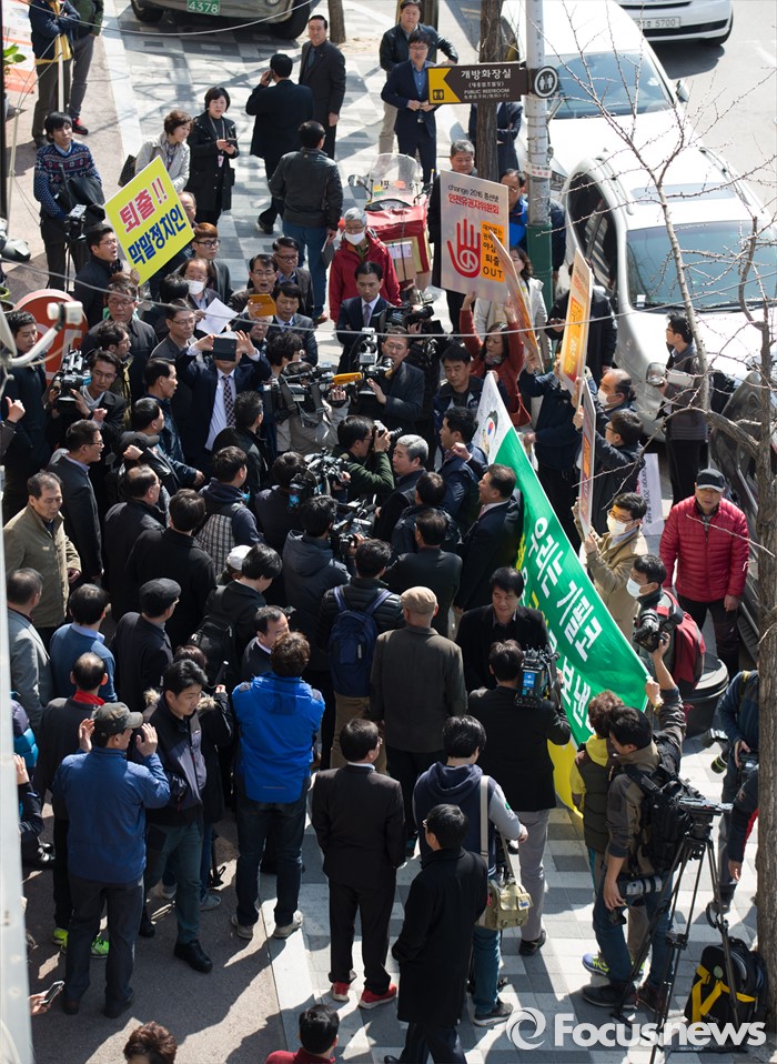 2016총선시민네트워크가 총선당시 진행한 낙선운동이 공직선거법 위반으로 고발당한 사건과 관련해 압수수색이 진행되고 있는 것으로 알려졌다.(인천=포커스뉴스) 새누리당을 탈당한 윤상현 의원의 무소속 출마 선언 기자회견이 열린 24일 오전 인천 남구 지역구 사무실 앞에서 2016 체인지 총선네트워크 인천유권자위원회 회원들이 윤상현 의원 출마 규탄 기자회견을 하고 있다. 2016.03.24 오장환 기자