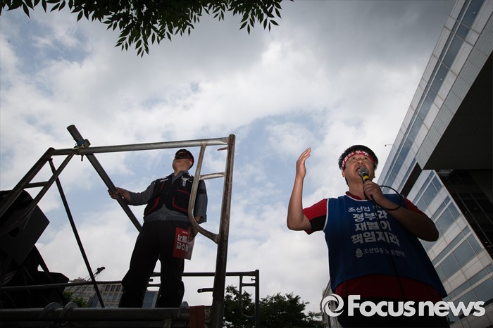 (서울=포커스뉴스) 이틀 전 총파업을 결의한 대우조선해양 노조가 16일 오후 서울 여의도 산업은행 앞에서 사측의 일방적 구조조정에 반대하며 상경투쟁을 벌이고 있다.
