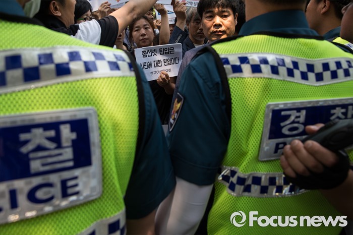 (서울=포커스뉴스) 17일 오후 서울 종로구 서울지방경찰청 앞에서 총선네트워크(총선넷) 회원들이 경찰 과잉수사 및 압수수색 규탄 기자회견을 하고 있다.