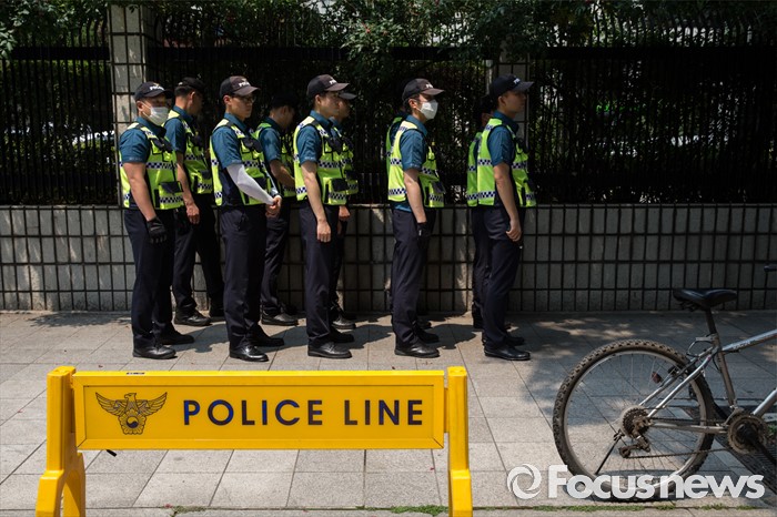 (서울=포커스뉴스) 17일 오후 서울 종로구 서울지방경찰청 앞에서 경찰들이 총선네트워크(총선넷) 회원들의 경찰 과잉수사 및 압수수색 규탄 기자회견을 지켜보고 있다.