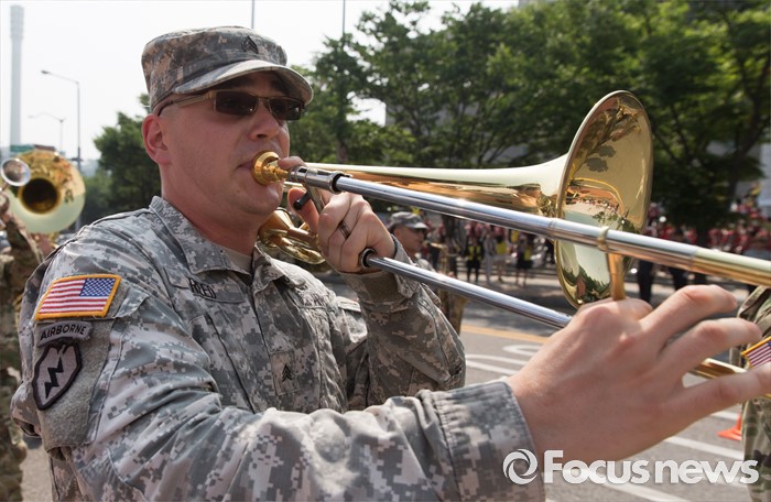 (서울=포커스뉴스) 18일 오후 서울 마포구 평화의 공원에서 열린 '호국보훈 땡큐퍼레이드'에 참가한 미국 군악대가 행진하고 있다.